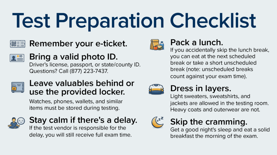 Home Exam Day Is Almost Here: A Last-Minute Checklist for the April Testing Window Exam Day Is Almost Here: A Last-Minute Checklist for the April Testing Window The ABFM Family Medicine Examination runs April 6 through April 25. Before your test date arrives, use this checklist to make sure exam day logistics are covered so you can walk in prepared and focused. April 2, 2026 Exam Day Is Almost Here: A Last-Minute Checklist for the April Testing Window Whether you are sitting for your first board examination or returning to recertify, the next few weeks are an important milestone. With the ABFM Family Medicine Certification Examination running April 6 through April 25, now is the time to make sure exam day logistics are locked in so you can focus on what matters most. Bring the Right Documents You will need two things at the testing center: your e-Ticket and a valid, non-expired, signature-bearing photo ID such as a driver’s license, passport, or state or county ID card. Your e-Ticket has important details about your examination and testing location, so keep it somewhere easy to grab. Questions about acceptable ID? Contact the ABFM Support Center at (877) 223-7437 or check your Candidate Information Booklet. Know What to Leave at the Door Personal items including your phone, watch, and wallet will go into a locker while you test. Review the Candidate Information Booklet ahead of time for the full list of what is and is not allowed in the testing room, so there are no surprises when you arrive. Stay Calm if Things Run Behind Technical delays happen occasionally. If the disruption is the testing vendor’s responsibility, you will still receive your full allotted time. Use any unexpected wait to breathe, reset, and get your head in the right place. Pack Your Own Food Bring a lunch. It removes one variable from an already high-stakes day. Eating is not permitted in the testing room, so plan to use your scheduled break. If you accidentally skip that break, you can wait for the next one without losing examination time, or step out briefly, though that time will count against your exam clock. Dress for Comfort To save time the morning of the exam, consider laying out your clothes the night before. Dress in layers; light sweaters and jackets are permitted in the testing room and can be added or removed as needed. Heavy outerwear is not allowed inside. Rest. Eat. You Got This! Skip the late-night cramming. Get a full night of sleep and eat a solid breakfast before you head out. You have put in the work. The best thing you can do now is take care of yourself so you can show up sharp and focused. Good luck to everyone testing this month. The care and commitment you bring to your patients every day reflects the higher standard at the heart of family medicine. For additional exam day guidance, refer to your Candidate Information Booklet or contact the ABFM Support Center at (877) 223-7437.